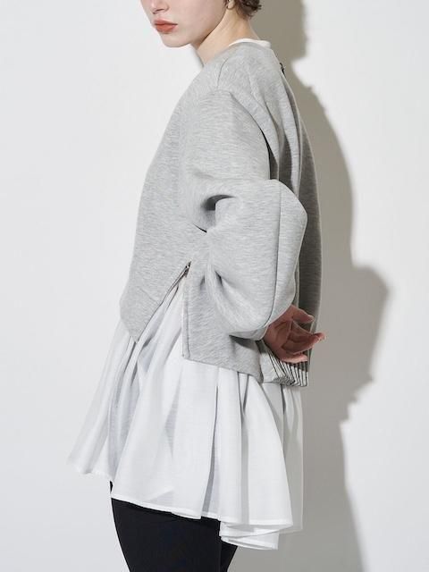 また、後ろ襟ぐりにメタルジップとレザーの引手をつけ、後ろ姿もデザイン性のある一枚。