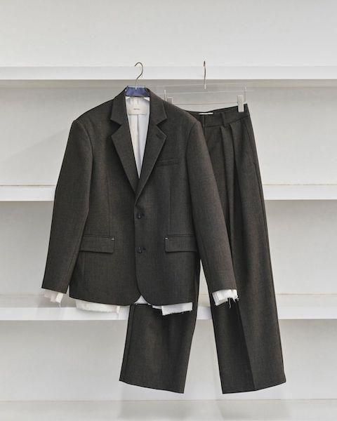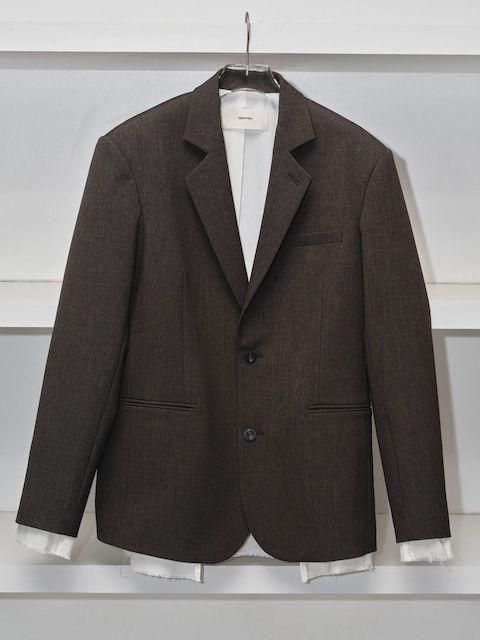 杢調で上品な質感の生地を使用したジャケット。厚みのある肩パッドで、オーバーシルエットなデザインがマニッシュ。裾や袖口からのぞく、カットオフ仕様の裏地が目をひく一枚です。