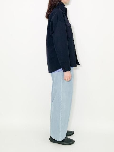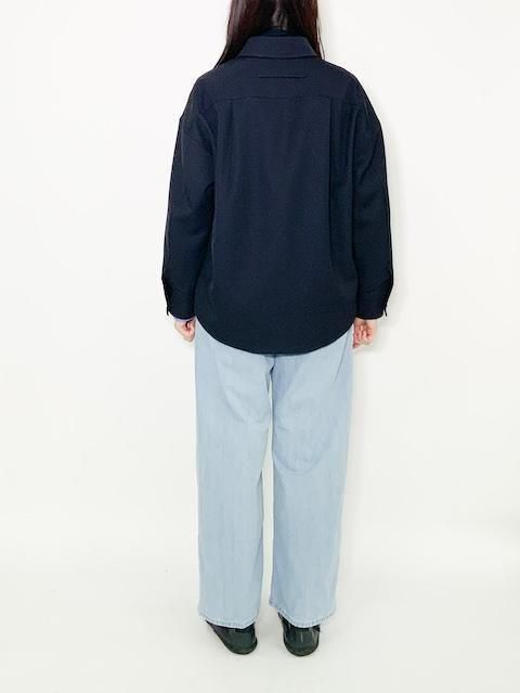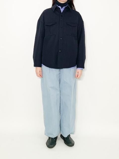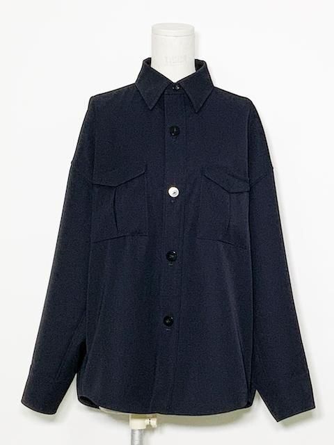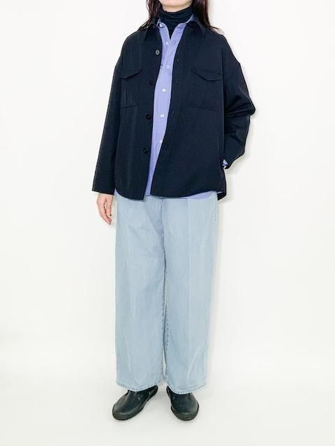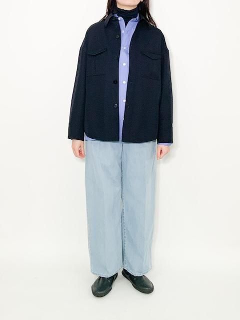 胸元のフラップや袖口のディテールなど、ミリタリーシャツジャケットの香り漂うアイテムを上品で知的な印象のウールで仕立てました。素材自体の醸す知的な色気、モード感が最大の魅力です。マニッシュな印象と相反してひとたび袖を通すと、その端正な表情と上品な光沢が女性らしさを引き立ててくれる1着です。裏地付きで脇にポケットがあり羽織としても万能なアイテムです。TICCAのシャツとの相性もよく、シャツ on シャツのレーヤードスタイルもおすすめコーディネートです。素材は紡績、織、仕上げ全ての工程を一貫工場で作られたウールギャバジンを使用。2/60のウール糸を限りなく高密度に織りコンパクトさを出し、更に含侵加工を加えています。程よい抜け感を出すために超軟水の天然地下で生地を洗い、絶妙なハリコシとしなやかさのある生地に仕上げた拘りのウールギャバジンです。