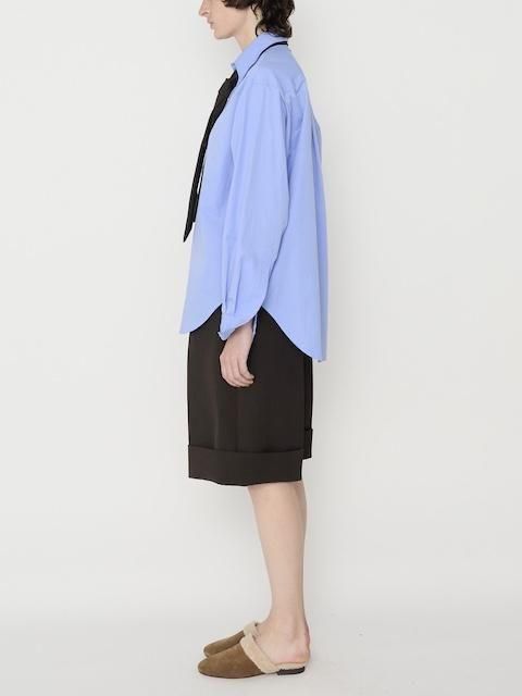 オーバーサイズのレギュラーカラーシャツです。襟と袖口に樹脂ワイヤーを施し、形を自在に動かせるようデザインしました。身幅と背中心のボックスプリーツで大きく寸法を確保し、袖口タックを2つ深く取り袖全体を太くオーバーサイズで着れるようにアレンジしています。スプリットヨーク、剣ボロ始末。 60番で細かい運針で縫製しています。裾口は立ち切りで洗いをかけて裾がほつれていく仕様です。スーピマ80/-高密度サテンに、揉み込みで細かいシワと膨らみを出し、反発樹脂でリラックス感のある上品な素材に仕上げました。