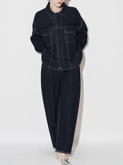 同素材のデニムジャケットとのセットアップコーディネートもおすすめ。