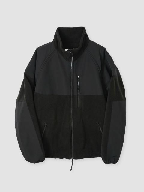 暴風と撥水機能のあるグログラン素材を胸から上と、フリースの潰れやすい肘に補強布として配しています。ファスナーはコイルファスナーを使用して軽量化してファスナー引き手にオリジナルのシュリンクチューブを取り付け開閉しやすくしています。