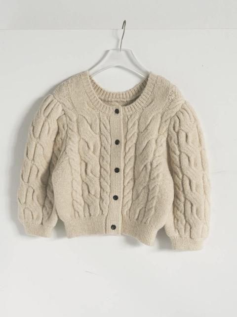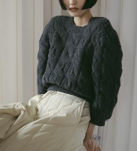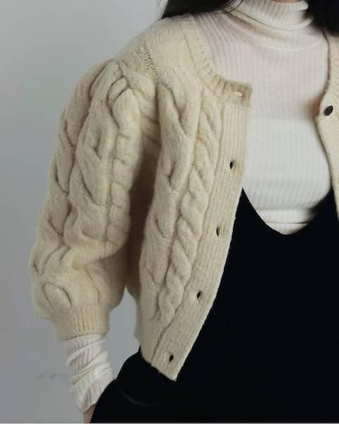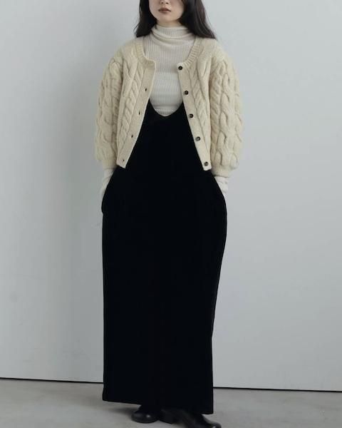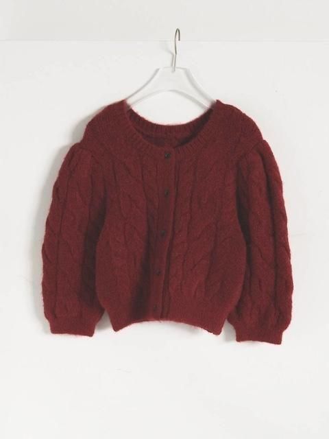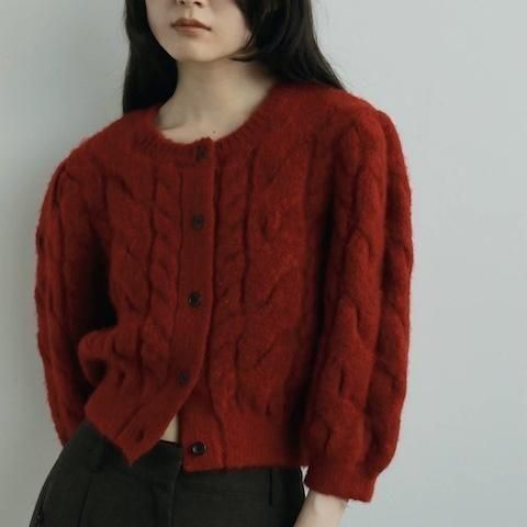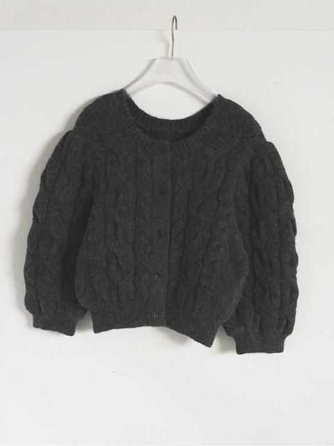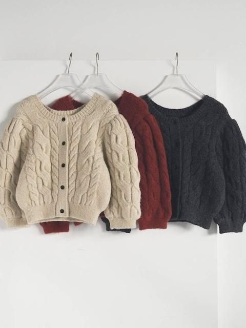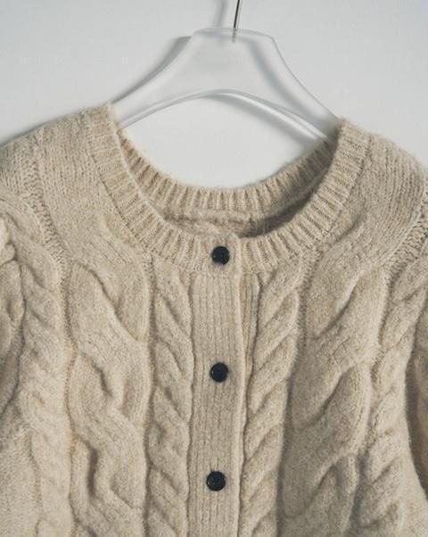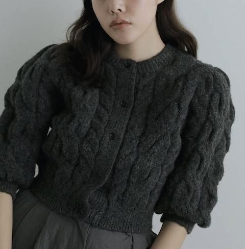 ふんわりと柔らかな風合いで仕上げたケーブル編みのニットカーディガン。丸みのある肘が隠れるくらいのハーフスリーブとコンパクトなショート丈で、女性らしく着ていただける一着。大きさの異なるケーブル編みをミックスさせ、スッキリと見せたい部分は細めのケーブルやフラットな編み地にすることで、ボリュームを出しながら着やすいシルエットになるよう調整しています。ボタン側を後ろにして、プルオーバーとしても着用可能。冬は中にコンパクトな長袖TOPSをレイヤードして着ていただいても可愛いです。シンプルなボトムに合わせるだけでコーディネートが一気に華やかになる一枚。