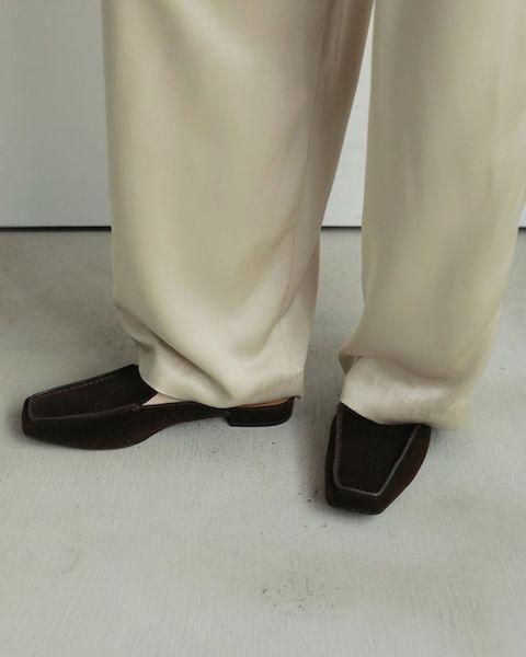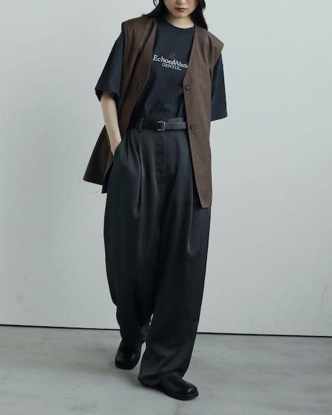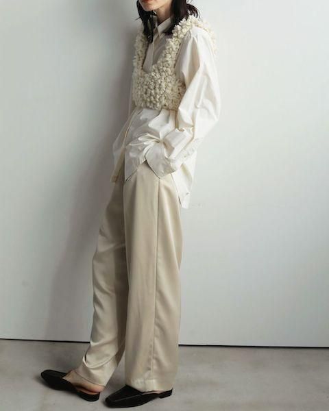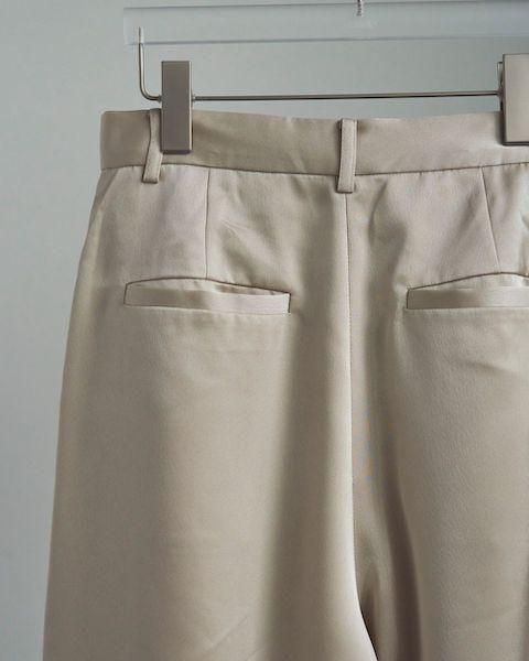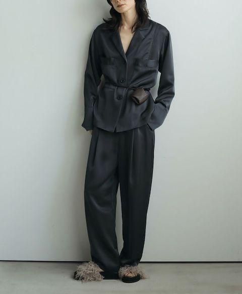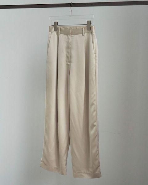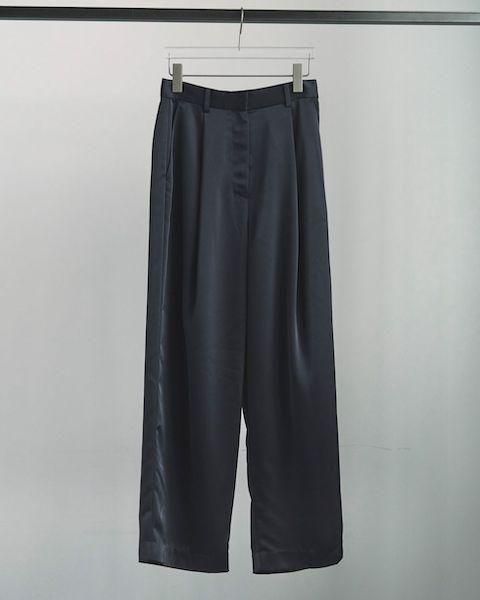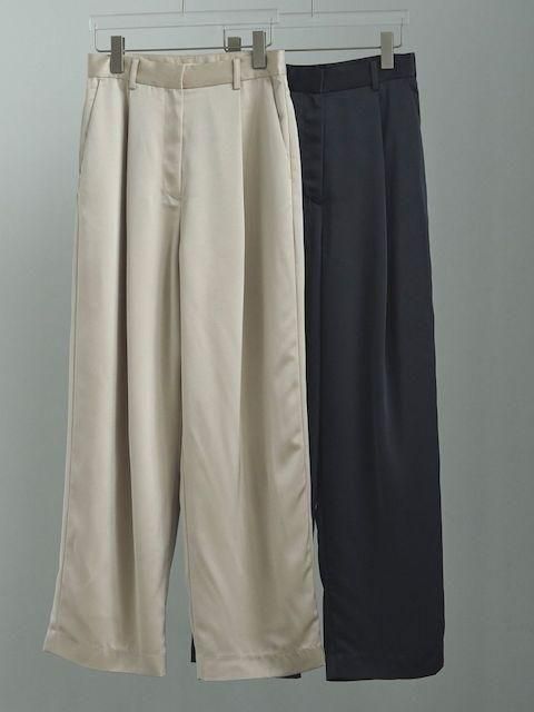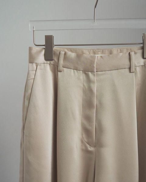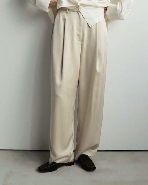中肉のサテン素材を使用したタックワイドパンツ。程良い光沢感と落ち感のあるしなやかな素材で、上品に履いていただける一本。シンプルで様々なスタイリングに着回していただけます。膨らみのあるニット表面感のあるアイテムと合わせて、素材をミックスさせた着こなしにもマッチします。滑らかな風合いで、ワイドシルエットでももたつかないので、ワンピースとのレイヤードにもおすすめ。同素材のSatin Tailored Shirtsとセットアップで着ていただくのも可愛いです。