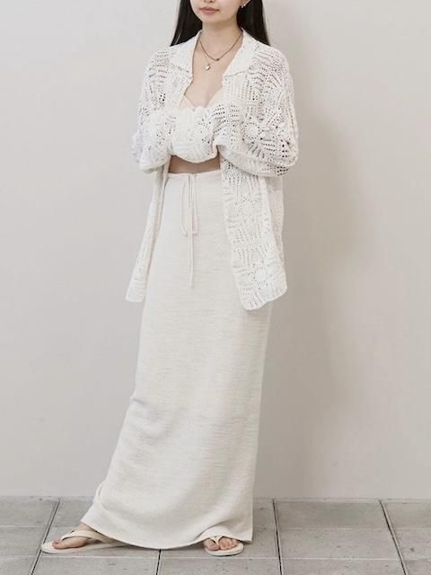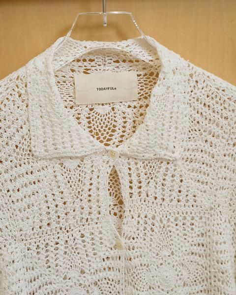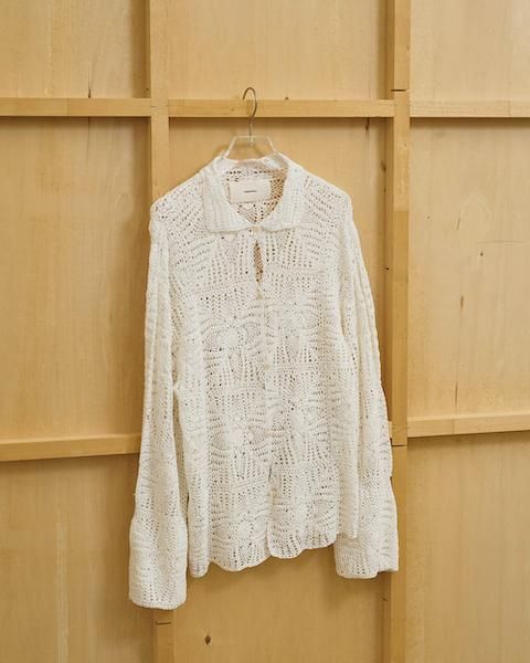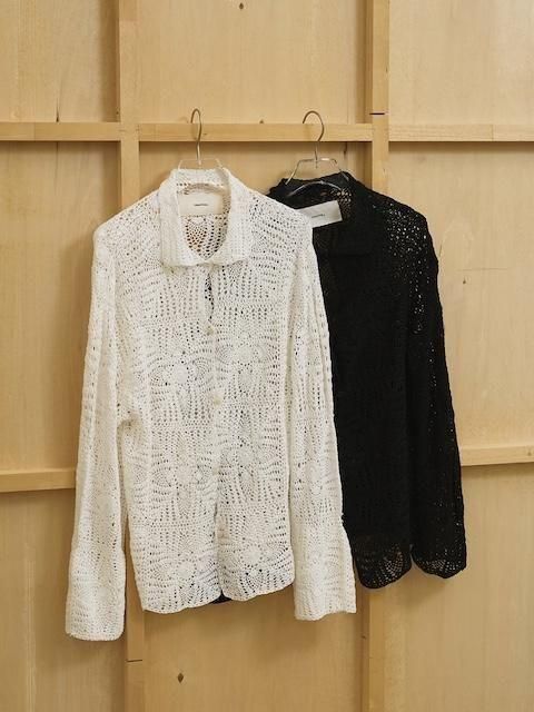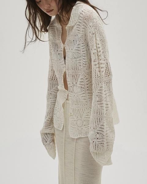 華奢なコットン糸を使用して、南インドで一つ一つ丁寧に手編みで編まれたかぎ針のニットシャツ。繊細な編み柄とシーズンムードたっぷりな素材感が魅力。透け感と体のラインに程良く馴染むシルエットが女性らしく、シンプルなボトムスに合わせるだけでこなれた印象に。