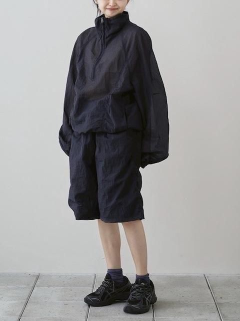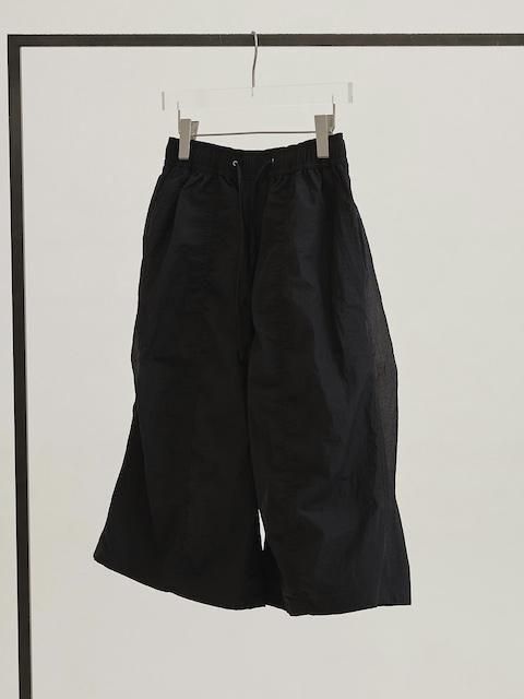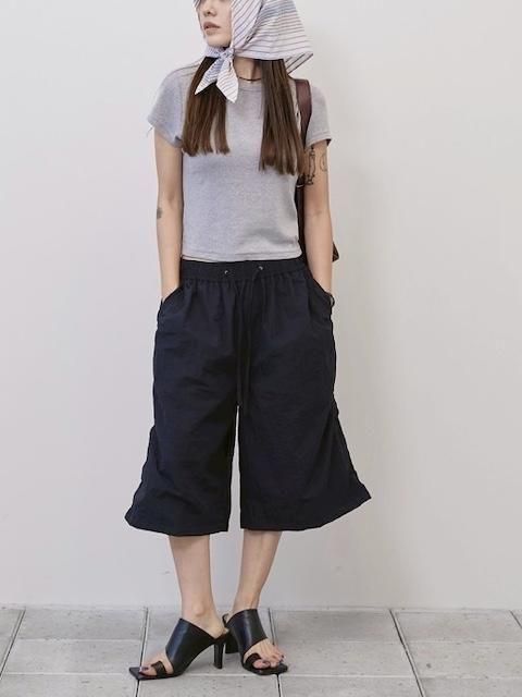 透け感のある細かなリップストップ生地を使用したハーフパンツ。ウエストの紐にあしらった飾りステッチや華奢な縫製、パッカリングの位置にまでこだわった一枚で、程よく張りのある生地感が立体的なシルエットを美しく保ちます。
