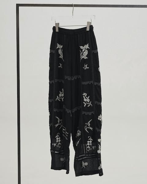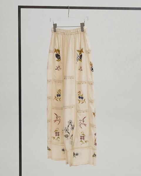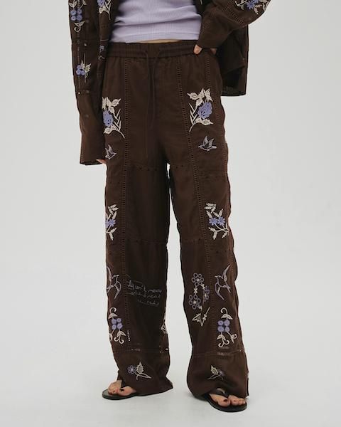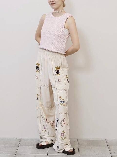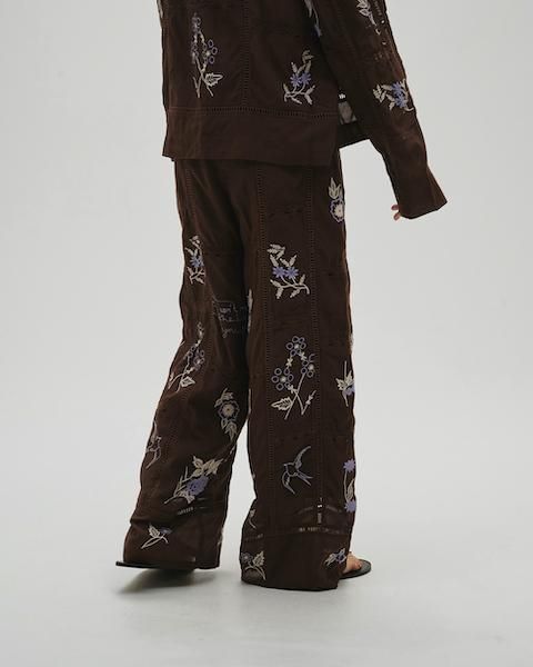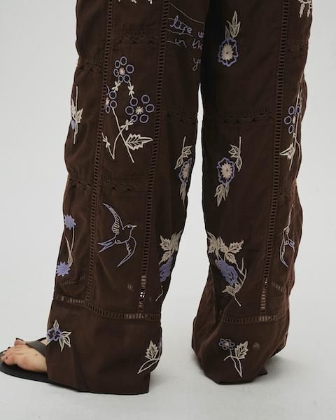 13種類もの刺繍をふんだんにあしらったパッチワークが目を惹くトラウザーズ。インドで一枚一枚に刺繍をあしらい、柄の配置や配色、パッチワークの入り方など、こだわりの詰まったアイテム。シンプルなトップストに合わせるだけでこなれた印象に。足元はフラットなサンダル合わせがおすすめです。