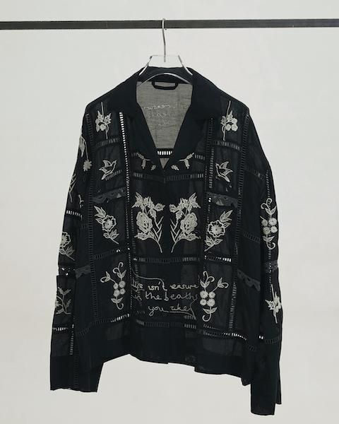 13種類もの刺繍をふんだんにあしらったパッチワークが目を惹く開襟シャツ。インドで