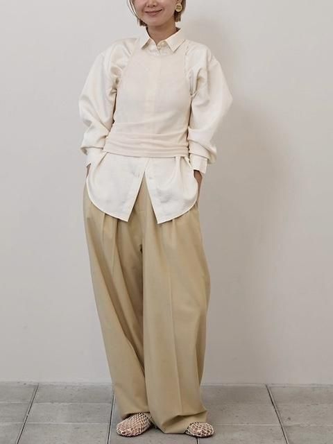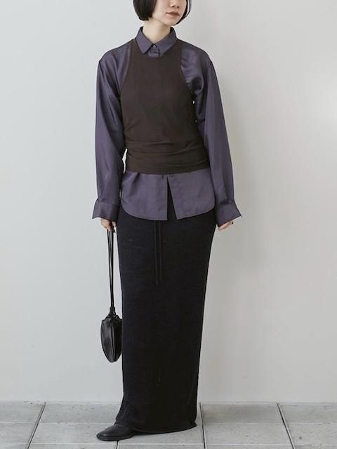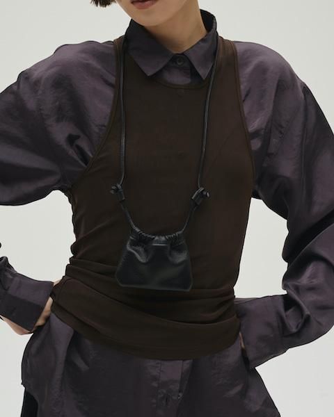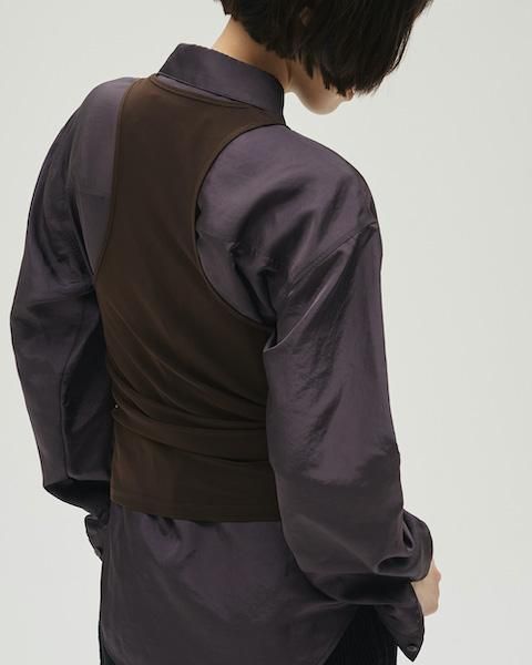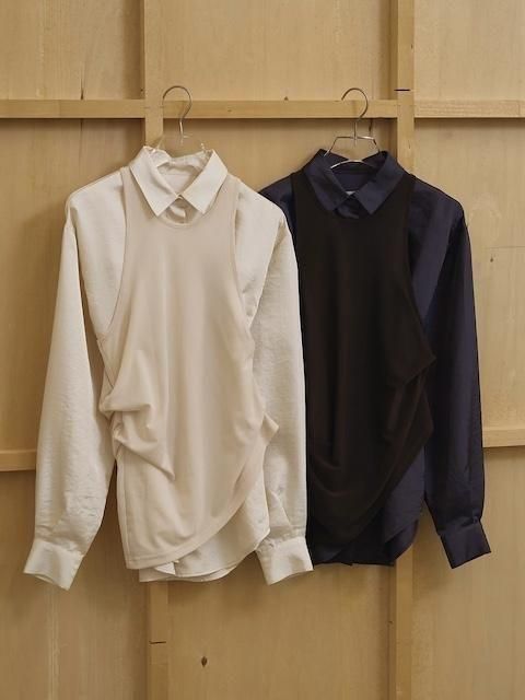 上品な光沢感のある生地を使用したシャツ。ゆったりとしたシルエットのシャツと、ストレッチの効いたメッシュタンクトップを組み合わせたデザインで、タンクトップのアシンメトリーなディテールは着用することで自然に捻れたシルエットが生まれ、動きのある印象を与えます。シーンに合わせてそれぞれ単品でも着用いただけるアイテムです。
