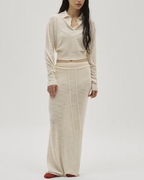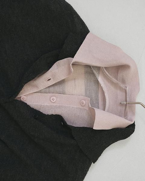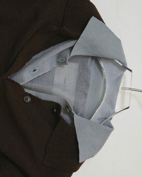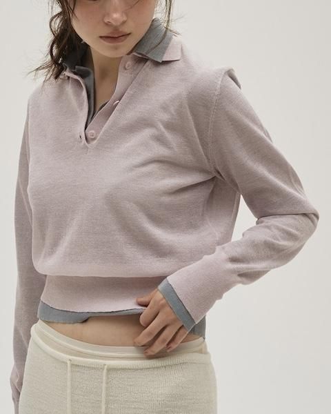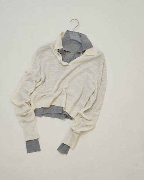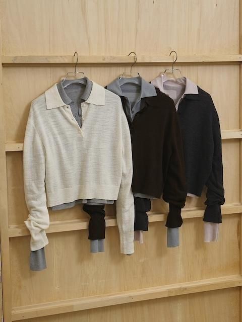 異なる糸を使用したレイヤードデザインがポイントのポロニット。配色がさりげないアクセントとなり、透け感のある編み地が軽やかさをプラス。