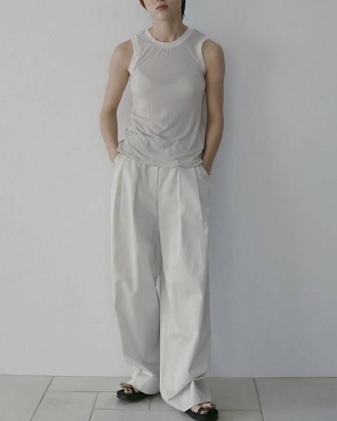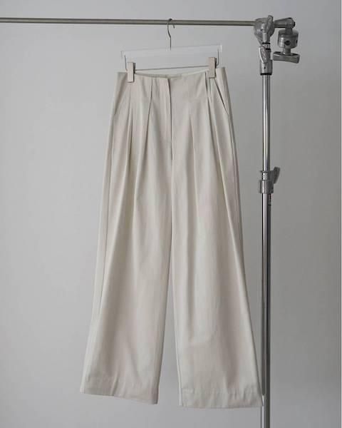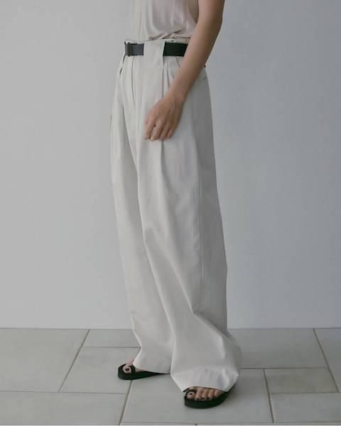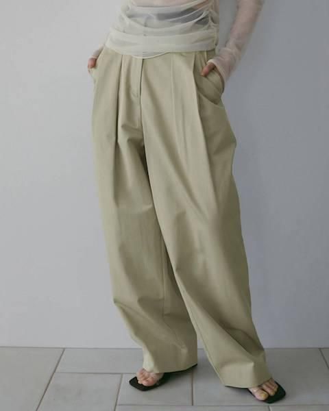 しなやかでこしのあるツイル素材を使用したワイドパンツ。ミニマルで幅広いトップスと合わせやすく着まわし力ある1本。ウエストの変形タックデザインが、トップスインしたりベルトをつけた際のポイントに。カジュアルな印象を纏いながら、控えめなステッチにすることで上品な仕上がりに。ほんのりとグレーがかったアイボリーとやわらかな印象のベージュの2色展開。ラフなシルエットで着こなしに自然な抜け感をプラスしてくれます。