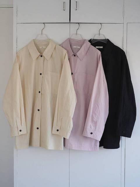 ステンカラーデザインで仕上げたオーバーシャツ。すっぽりと腰回りを覆ったラフなサイズで、軽めの羽織りとしても着回していただきやすい一枚。洗い晒したような自然なシワ感のある素材を使用し、ステッチを効かせカジュアルな仕上がりに。シーズン問わず使える万能なアイボリーとブラック、甘くなり過ぎない少し青みがかった絶妙なトーンで仕上げたピンクの3色展開。黒のボタンを使用し、淡色は配色がアクセントになり、全色モードな印象で着ていただけます。