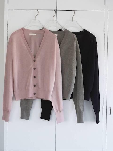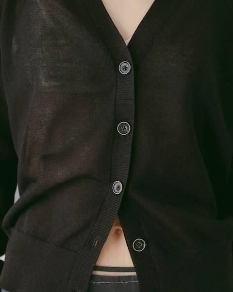 ハイゲージで仕上げた薄手のVネックカーディガン。着回し力あるミニマルなデザイン。ほんのりと透ける上品な編み地で、春の羽織りとしても活躍する一枚。程良くルーズなシルエットとデコルテが見えるVネックで、女性らしく抜け感ある印象に。前を留めた際も、フロントのデザインボタンがアクセントになり、プルオーバーとして着た際も、コーディネートに映えます。同素材のHighgauge Sheer Tanktopとのレイヤードスタイルも楽しんでいただきたい一着。肩にかけたり、腰に巻いたり、スタイリングのポイントとして着回していただくのもおすすめです。