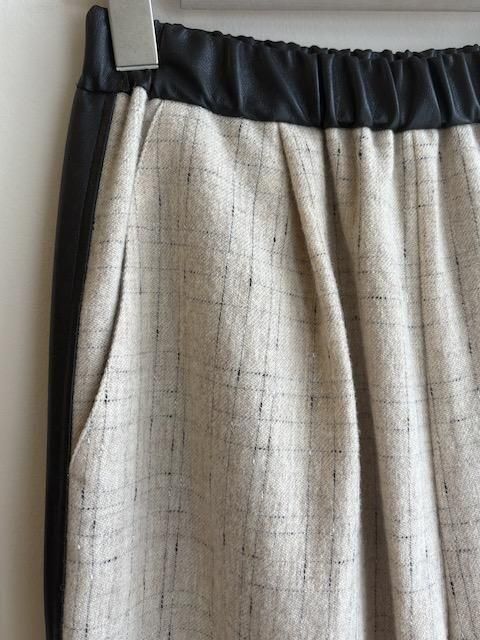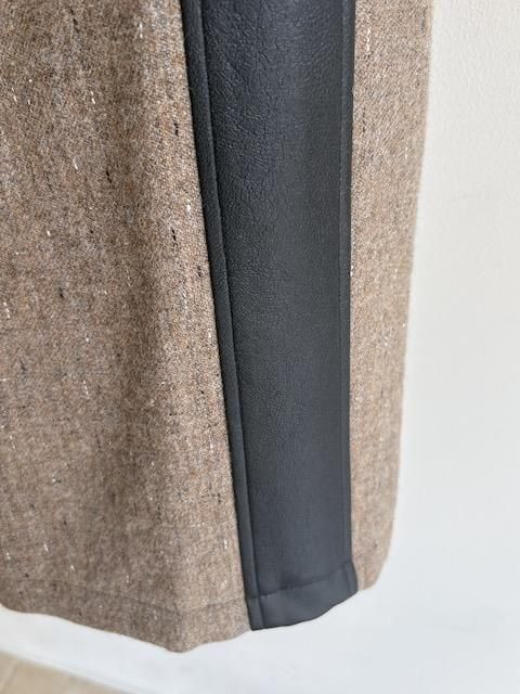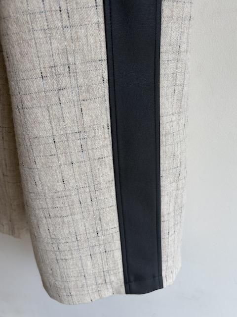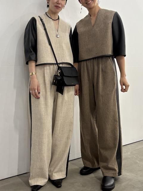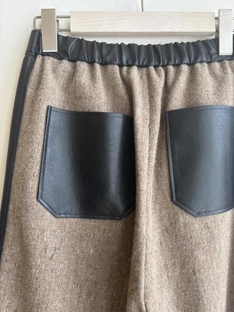 素材の表情が際立つプレーンなウールベースに、合皮の質感が静かなコントラストを添え、ミニマルな中に洗練されたアクセントを効かせています。